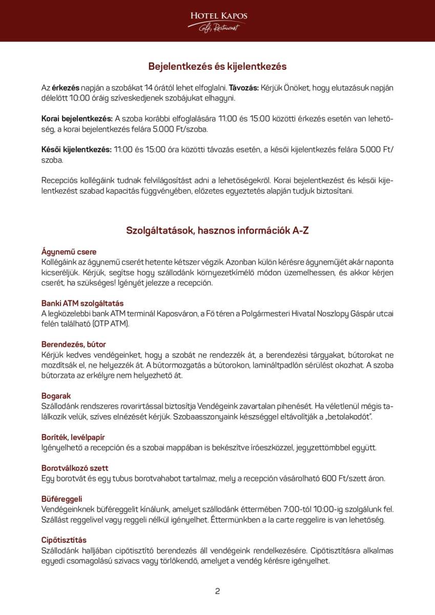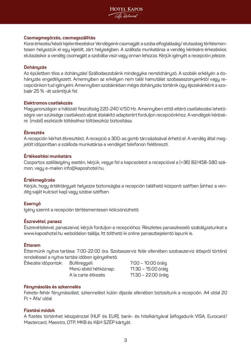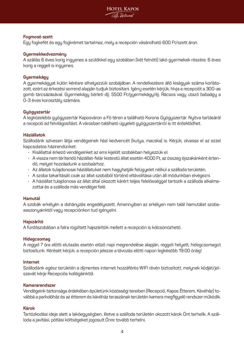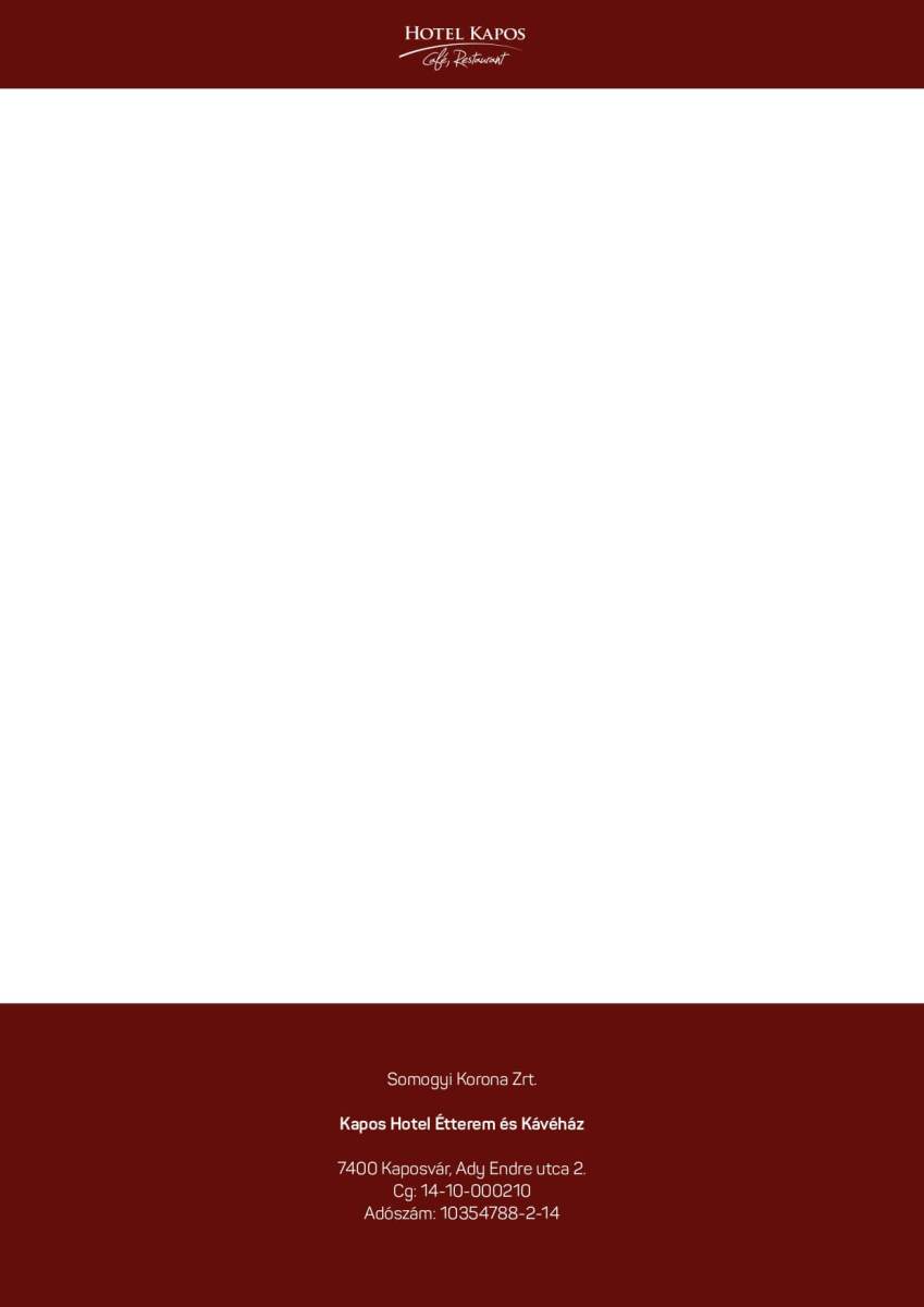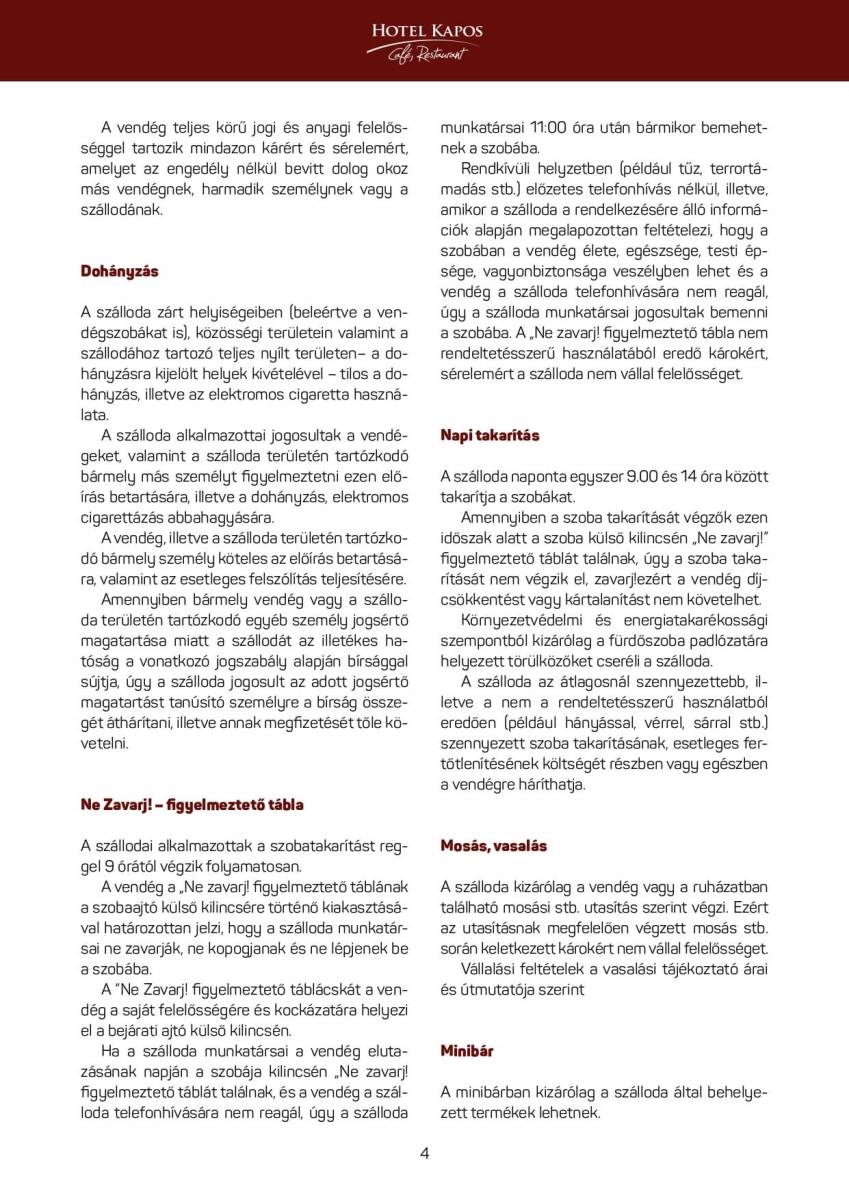 A Kapos Étterem házirendjét megtekintheti a képre kattintva, lapozható formátumban (a képek melletti nyilak segítségével tud lapozni előre és hátra az oldalai között), vagy a képek alatt megtalálja letölthető formátumban (pdf) is.