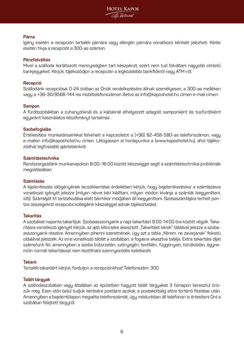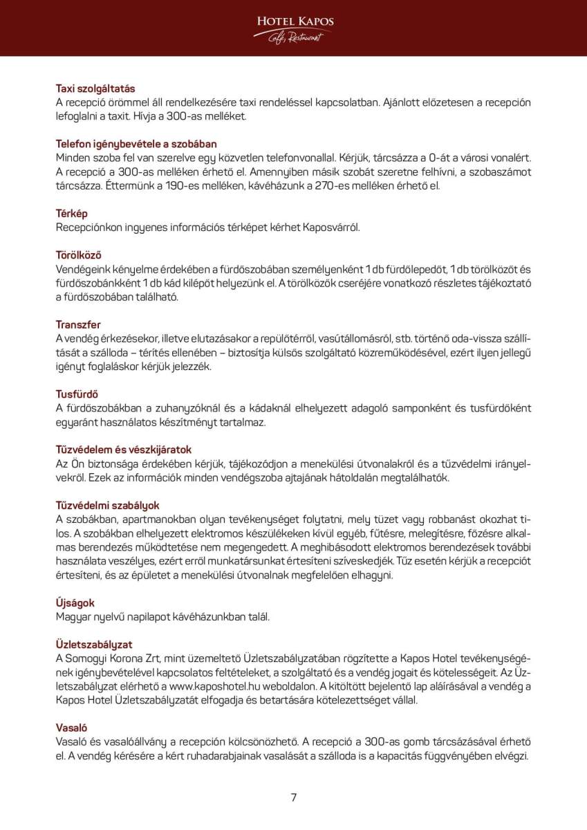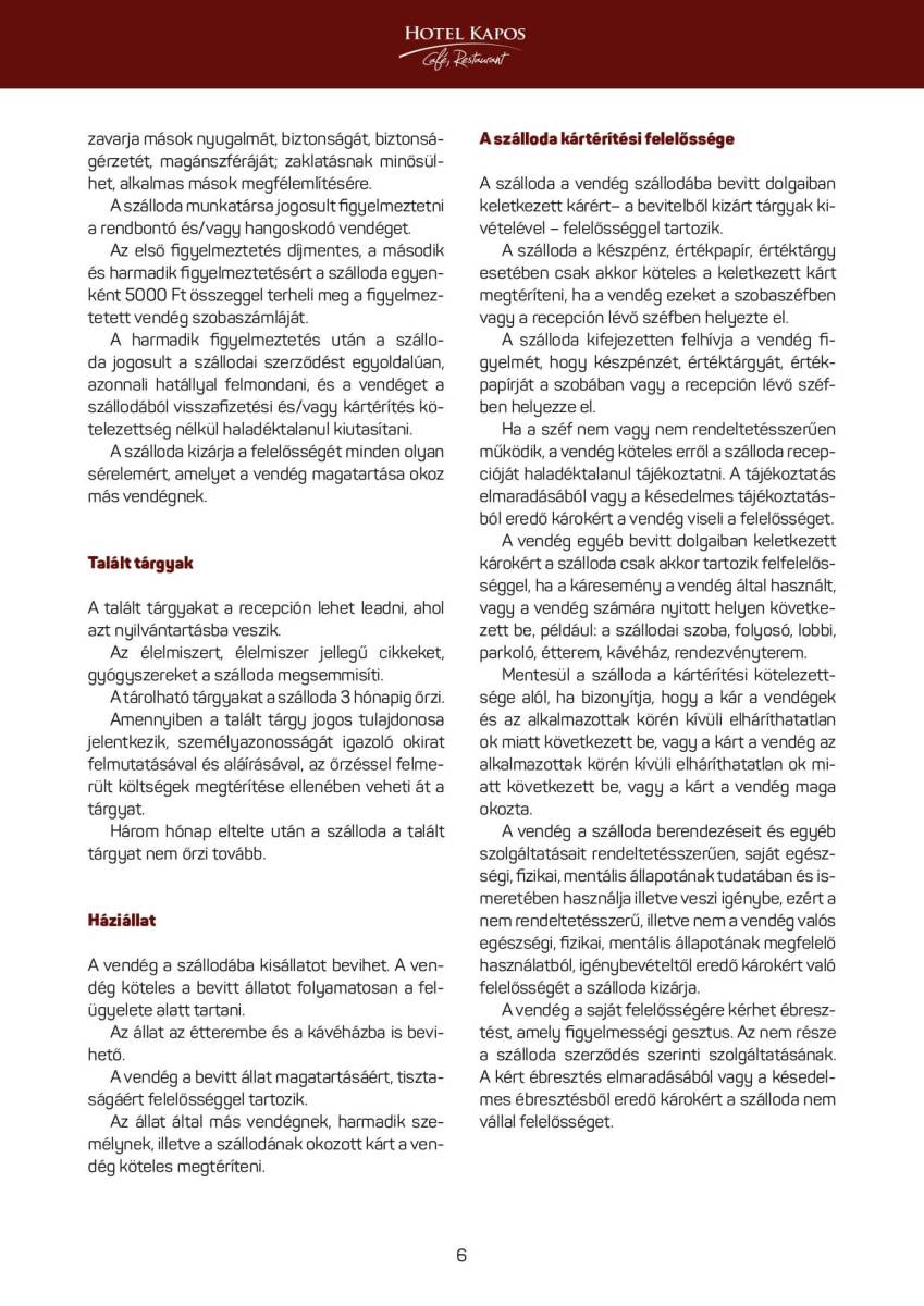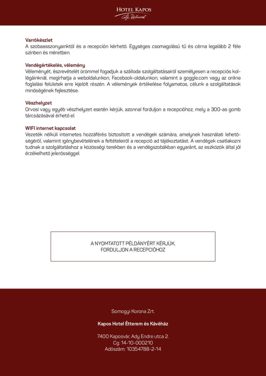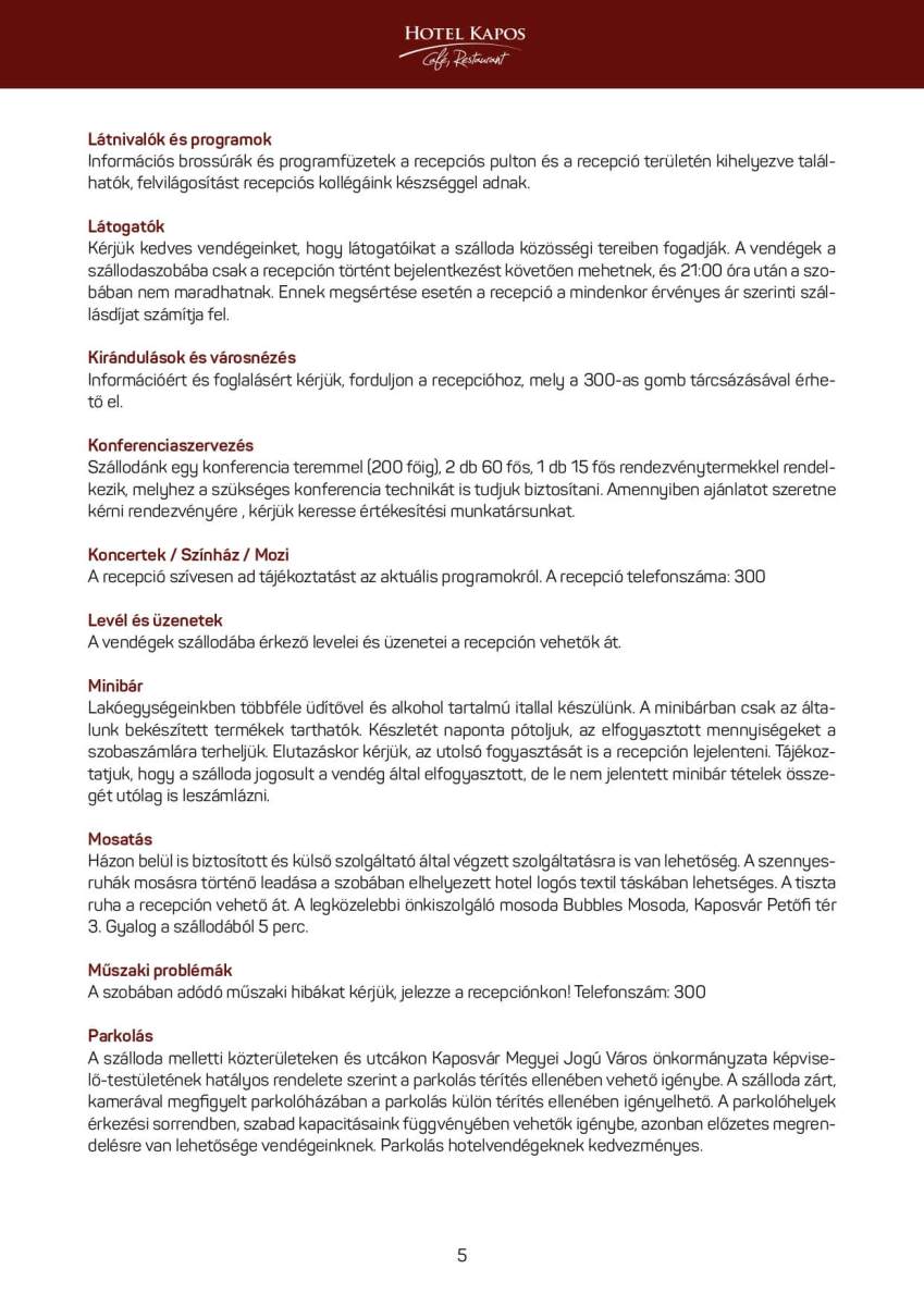 A Kapos Étterem házirendjét megtekintheti a képre kattintva, lapozható formátumban (a képek melletti nyilak segítségével tud lapozni előre és hátra az oldalai között), vagy a képek alatt megtalálja letölthető formátumban (pdf) is.
